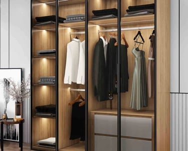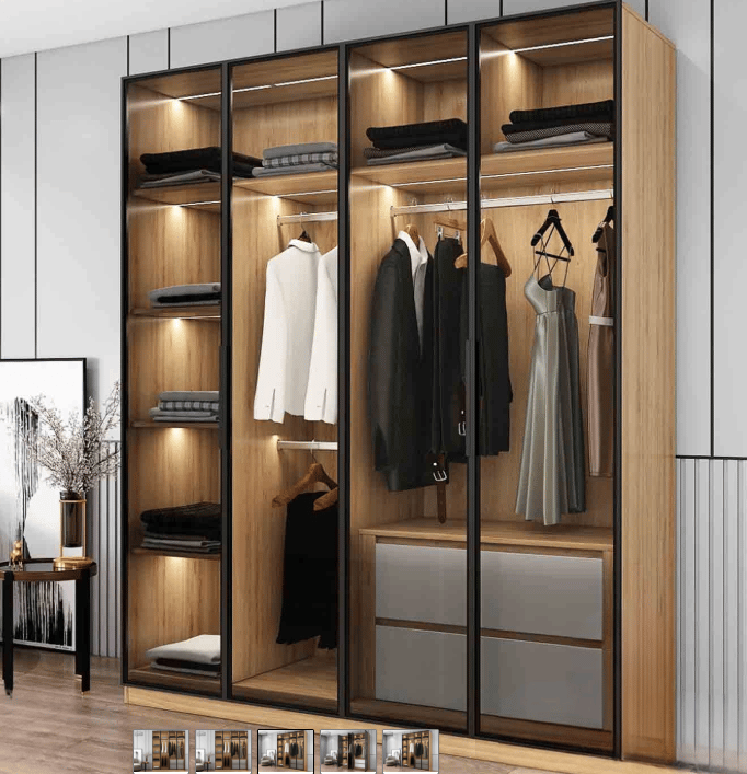 Buồng giữa (Trung tâm): Điểm nhấn là khoang treo đồ dài với chiều cao 134cm, lý tưởng cho váy dạ hội, áo măng tô hoặc áo dài mà không lo bị nhăn gấu. Bên cạnh là hệ ngăn kệ linh hoạt (kích thước 33-38cm) dành cho túi xách hoặc quần áo gấp gọn.